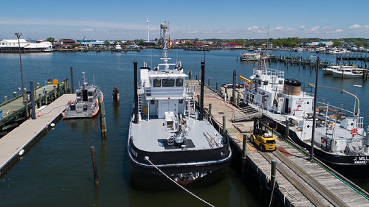 M/V Eddie Somers, a 94-foot buoy tender that is the primary icebreaking asset for Crisfield Harbor and Smith Island, serving as a lifeline to islanders by clearing a path for supply and shuttle boats. It also assists the U.S. Coast Guard as requested with emergency deliveries to other areas of the lower Eastern Shore, including Tangier Island in Virginia.