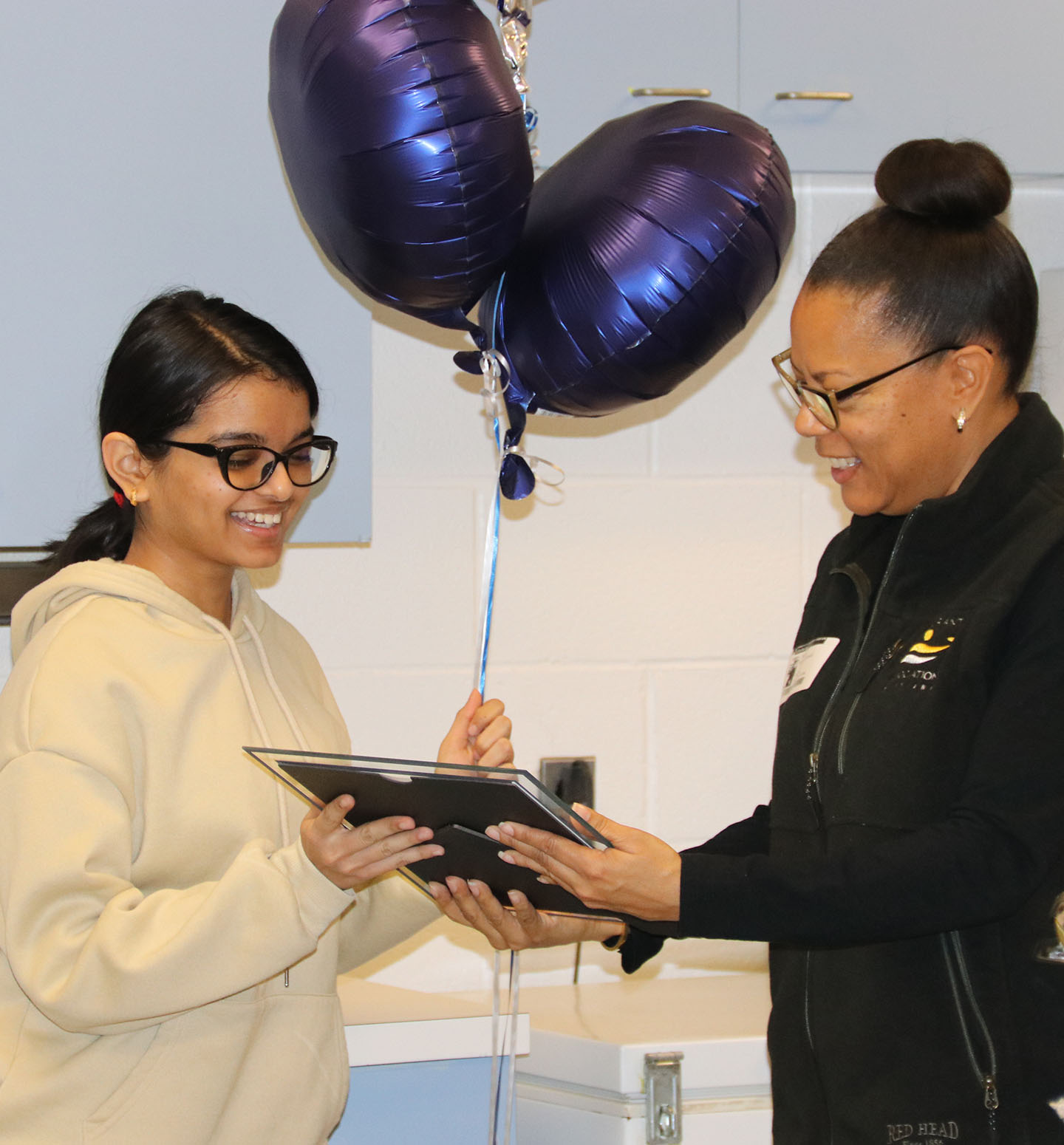 Shreja Patel, left, a junior at La Plata High School, receives an award from Tajala Battle-Lockhart, director of programs and education with the Restaurant Assocation of Maryland (RAM).