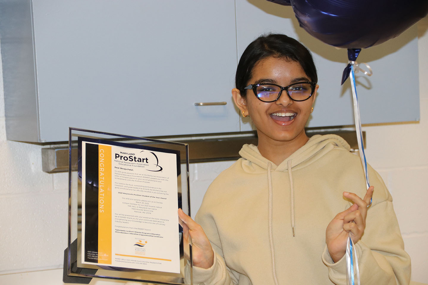 Shreja Patel, a La Plata High School junior, has been named the 2022-2023 ProStart Student of the Year by the Restaurant Association of Maryland (RAM) Education Foundation. Patel was recognized for her dedication to the ProStart Food and Beverage Management class, where she has learned the ins and outs of the restaurant and hospitality business, from food preparation and sanitation to marketing, accounting, and customer service.