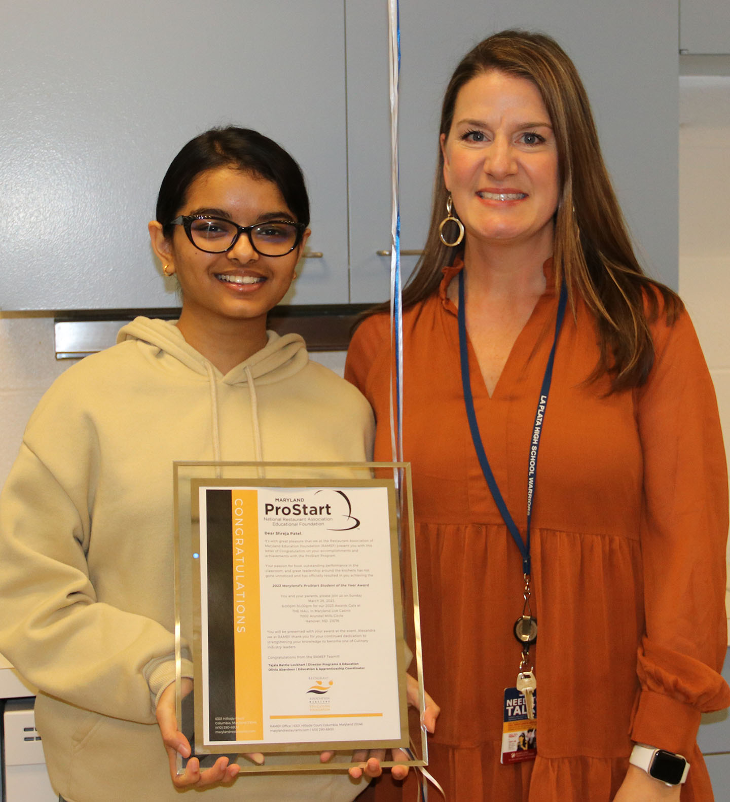 Mary Winkler, right, a teacher at La Plata High School, nominated her student, Shreja Patel, left, to be named ProStart Student of the Year.