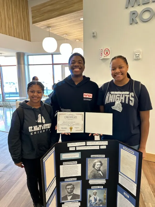 Other awards won by SMR students included the St. Mary's County Genealogical Society Best Use of Primary Sources, which was awarded to Patrick Surfus for his Empowerment of Women during WWII project. The STEM/STEAM & History Award went to Marissa VanMeter, Yemi Ojomo, James Morton, and Lyndon Porter for their project on Penicillin. The Historic Sotterley Award for Equality & Equity went to Nasir Ntewo, Jasemine Edison, and Sydney Johnson for their Reconstruction Era Civil Rights project.