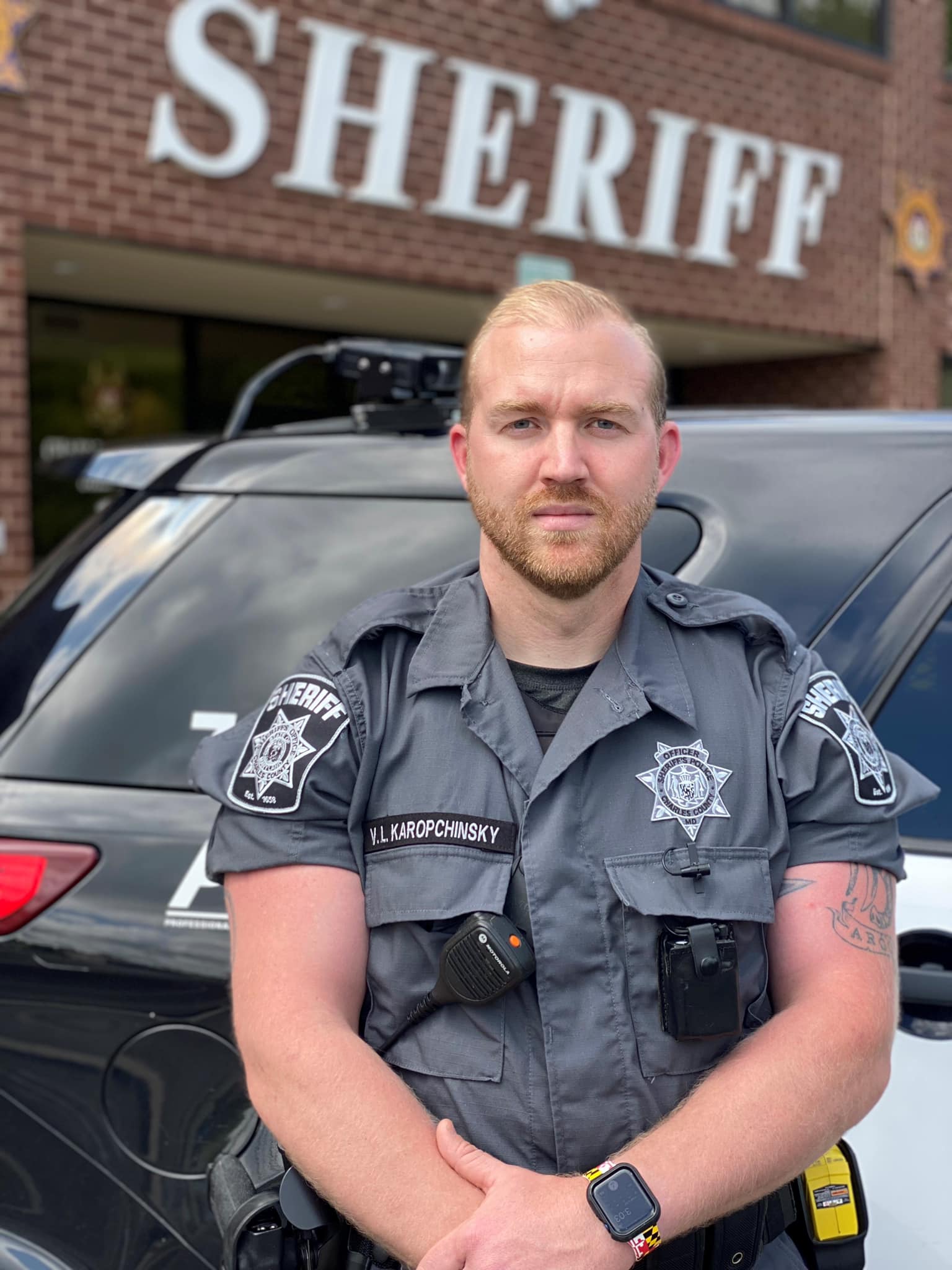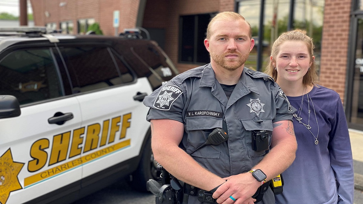 Charles County, Maryland – On April 21, Officer Karopchinsky and his wife, Ashley, experienced empathy firsthand on top of a busy highway overpass in Baltimore. The couple was going to a comedy show when they saw a young woman in distress near the jersey wall. Without hesitation, Officer Karopchinsky ran up to the woman and pulled her to safety.
