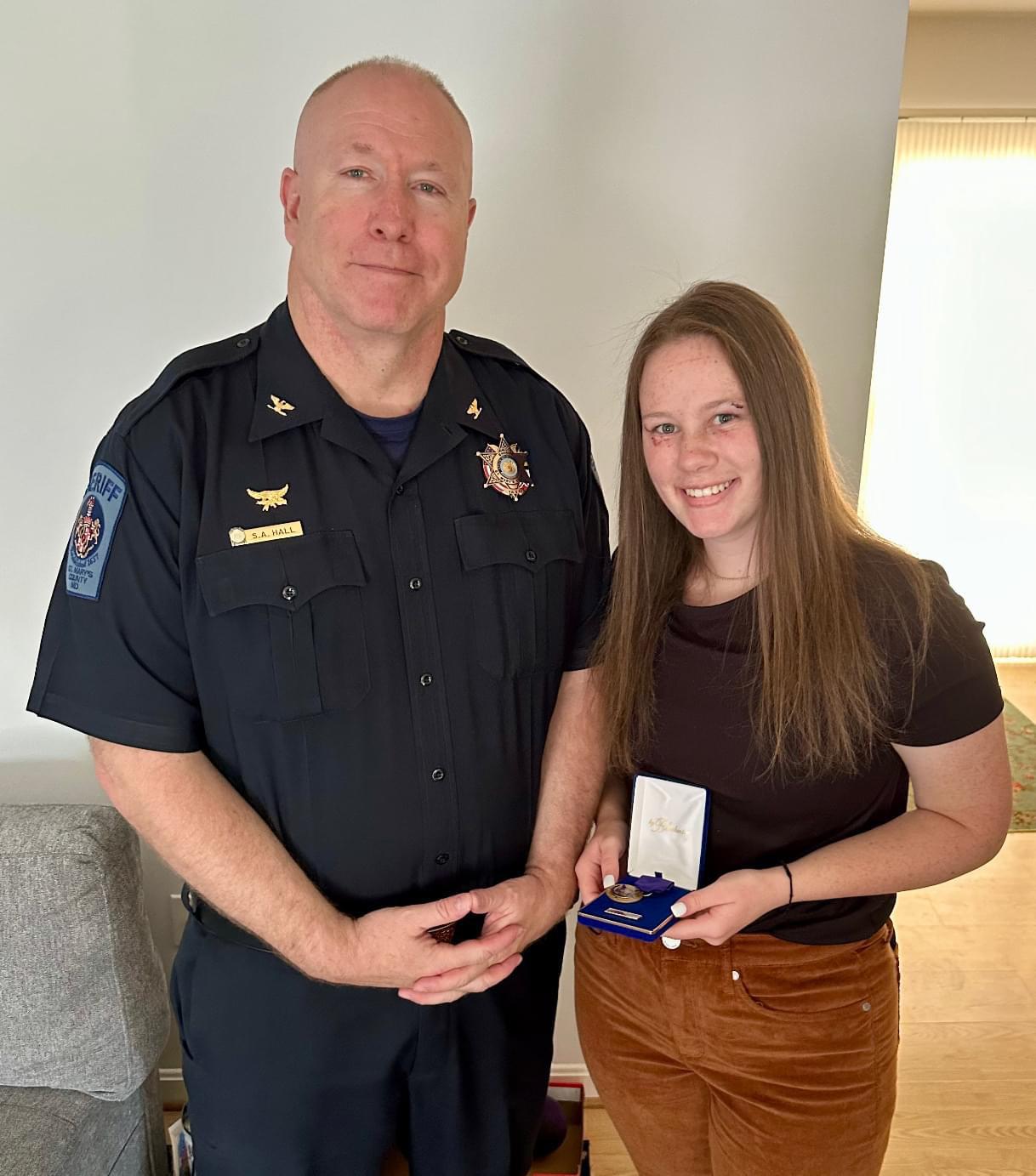 Officer Suite was subsequently transported to MedStar St. Mary's Hospital for treatment. On Saturday afternoon, Sheriff Steve Hall visited Suite at her home, awarding her the Sheriff's Office Purple Heart Medal.