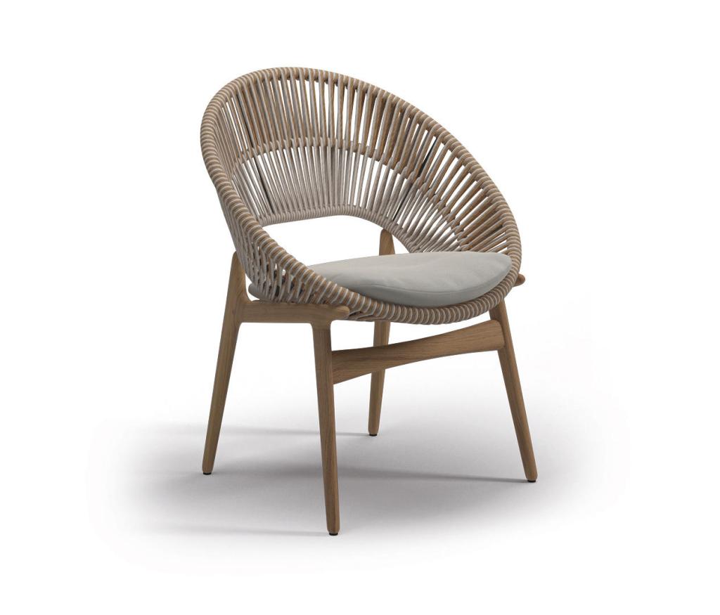 The Bora Dining Chair by Gloster harmoniously combines teak's natural elegance with modern comfort. Its gracefully contoured teak frame and outdoor upholstery create a timeless and inviting outdoor dining experience, where sophistication meets relaxation.