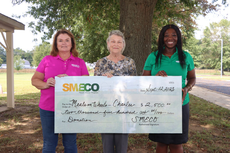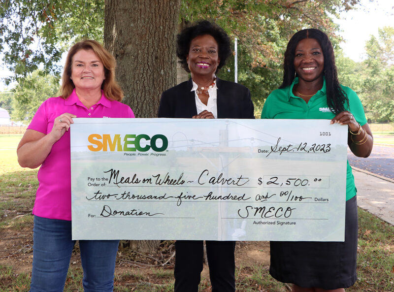 Shirl Hendley, president, Calvert County Meals on Wheels, receives a check for $2,500 from Sonja Cox, SMECO president and CEO (left) and Natalie Cotton, SMECO government affairs and community relations director (right).