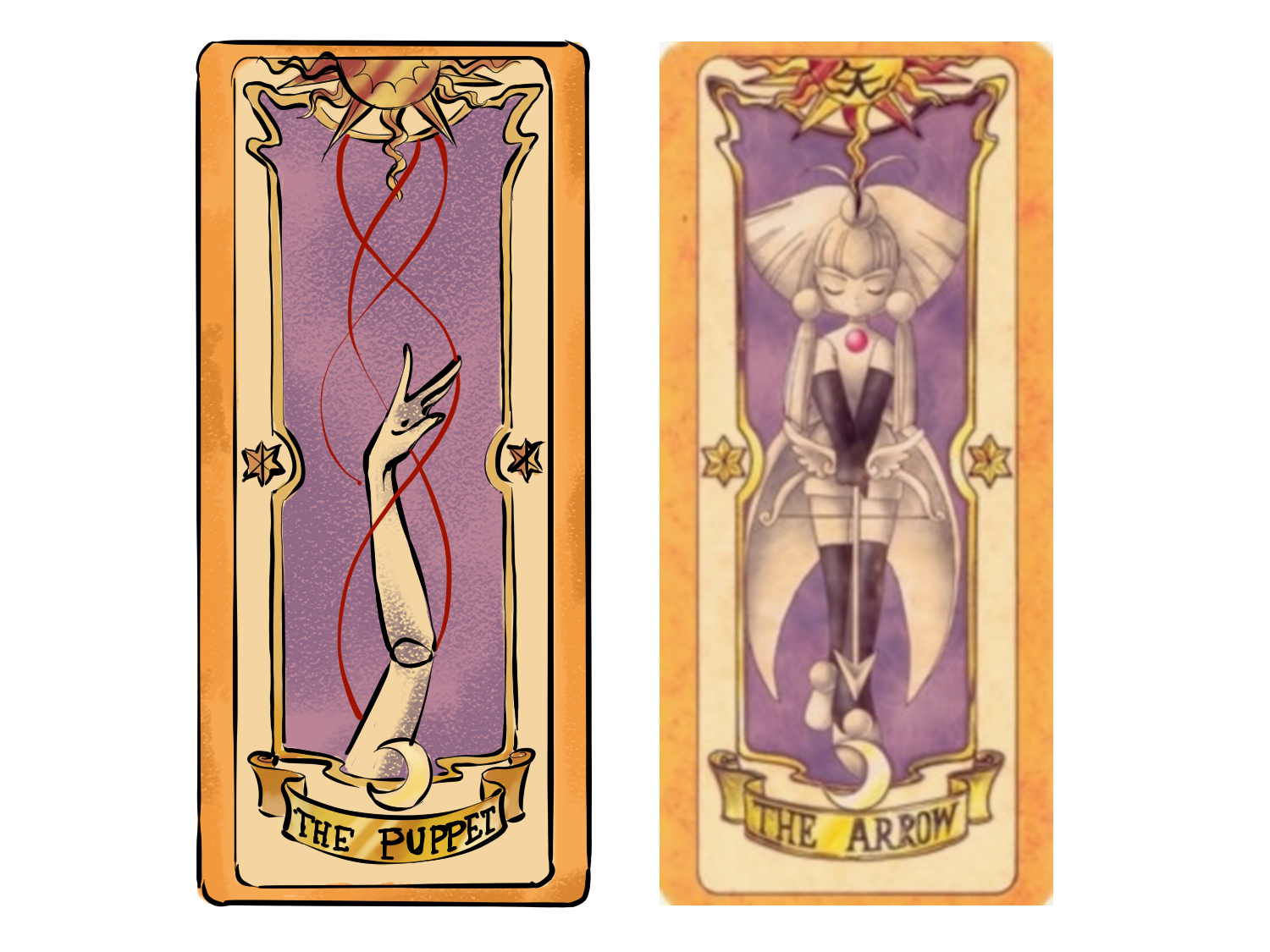 The titular character, Sakura, summons Clow Cards, each of which has a unique ability which can aid her in battles and daily life. The idea was that I would design a new Clow Card for Sakura to use. I agonized over what the card would be, but I settled on The Puppet, which can control people's movements. I had twenty-six ideas in total, so it was hard to choose. I would like to make honorable mention of The Lighthouse, which would be a light guiding her to wherever she wanted to go, and The Gun, which is a gun.