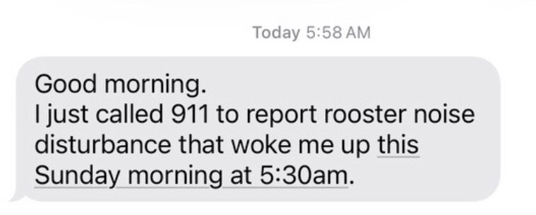 At 5:30 AM this morning, yes on a Sunday no less, the neighbors of Laurel Circle were awakened from their weekend slumber by a noisy rooster and kind of like nails on a chalkboard with deep ridges at this point, right?