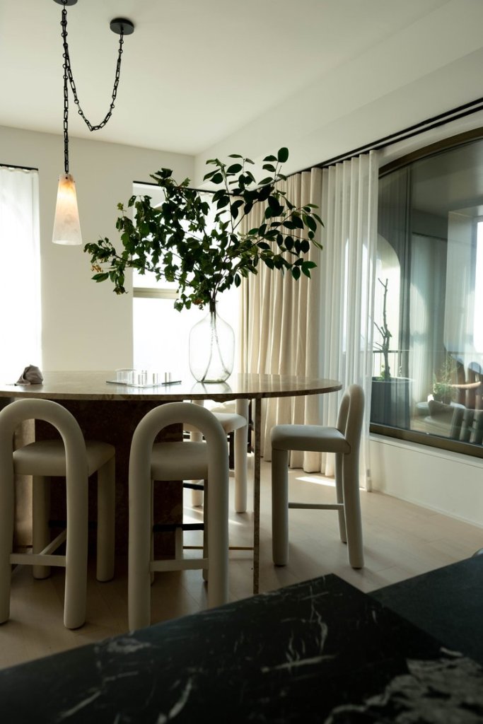 Almost sixty floors up, this Castle in the Clouds exudes the essence of home. BE has masterfully brought to life the contrast of contemporary lines and curves, organic materials, and warm hues.