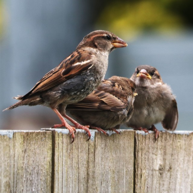 Female sparrow and her young on our garden fence