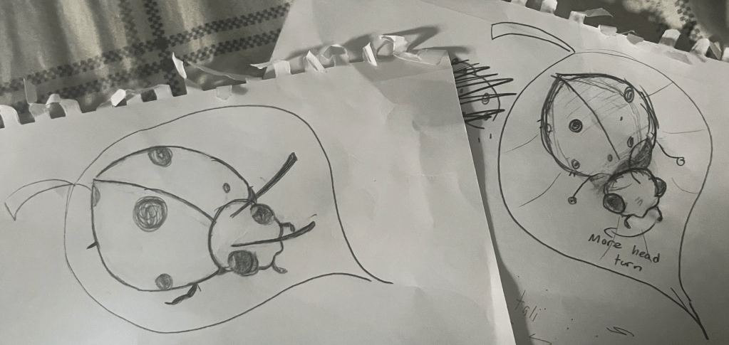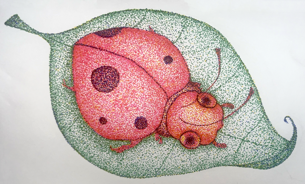 During my first year at Marywood University, I took a drawing class that involved a project based on the stippling drawing technique, and I thought it was a super fun process. Recently, I was inspired to give stippling another try when I stumbled upon a… | By Italia Storey on July 30, 2024 | During my first year at Marywood University, I took a drawing class that involved a project based on the stippling drawing technique, and I thought it was a super fun process. Recently, I was inspired to give stippling another try when I stumbled upon a cute little pack of Sharpie fine-liners with some fun colors at my job, and I thought this would be the perfect excuse to buy them. These fine point markers proved to be resilient as I had to of put at least a million dots into creating the ladybug, while the points remained intact and pigmented when I was finally done. The only grievance I have is that the light blue was completely dried up before I bought them, which is such a shame since light blue is arguably one of the best colors in the pack. Although it is very tedious to strategically dot a paper to create a cohesive image, I found the process to be very relaxing and therapeutic for me. I got so wrapped up in working on this drawing that I found myself in a sort of trance, to the point of having to continuously rewind my podcast since I could not focus on anything besides the paper.  I chose to draw a ladybug for no particular reason besides the fact that I never really draw bugs and I knew I wanted to incorporate my cutesy style into the work, and I immediately thought of the adorable ladybug. I spent a long time deciding how stylized I wanted the bug to look as I wanted it to be somewhat anatomically correct yet still cute and went through a ton of mildly horrifying alien-bugs until I settled on this design. I love how it came out and thought it kind of looked like a little Pokémon, and I am especially proud of the ladybug's eyes. It was super fun watching the image come together as I finished dotting each section and experimenting with the colors. I had originally thought I was finished with the ladybug's darkest color being red until I tried using a dark blue for the outline, spots, and eye details. Immediately the drawing was improved and much more dynamic. It took absolutely forever to finish between the endless dotting and contemplating what else I could do to improve the drawing, but in the end I am very proud of the piece and will definitely continue to experiment with the stippling technique in the future. | | | |