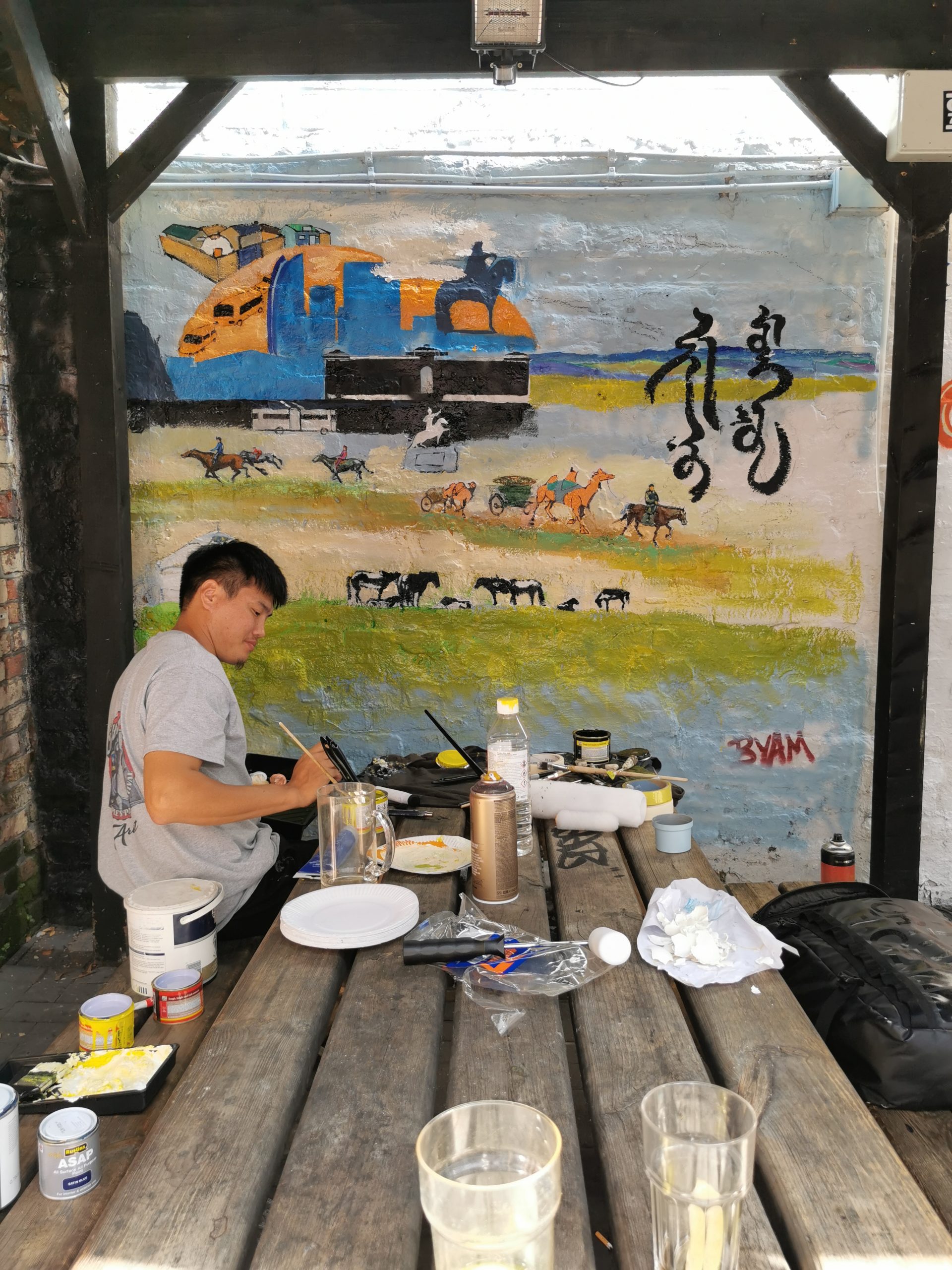 Phase Chan painting in the Frog and Fiddle yard. This is the second year in a row that Chan has painted in the location