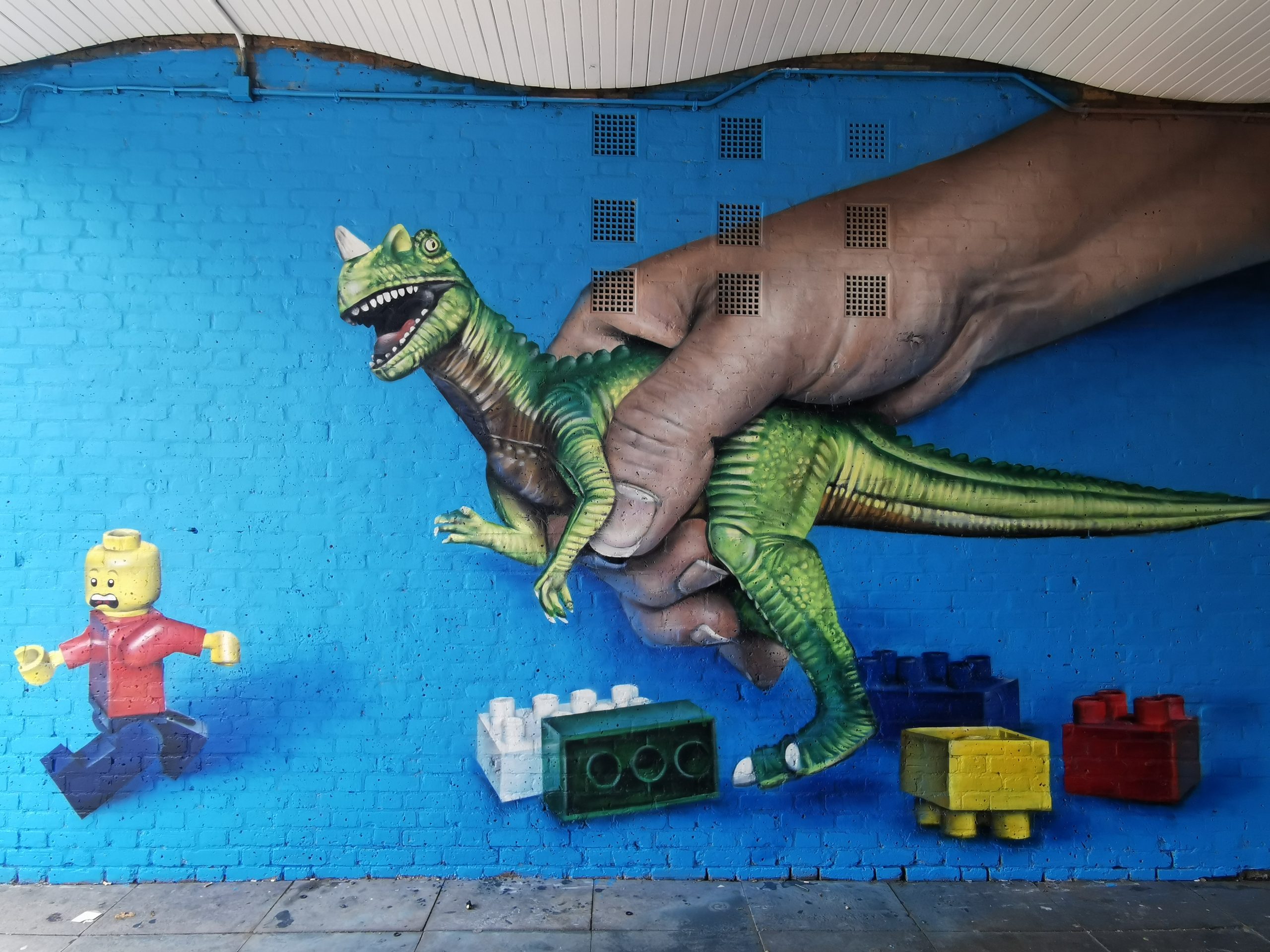 Katie Scott's mural is in a little underpass on xxxx. It shows a child's game being played with lego and a dinosaur.