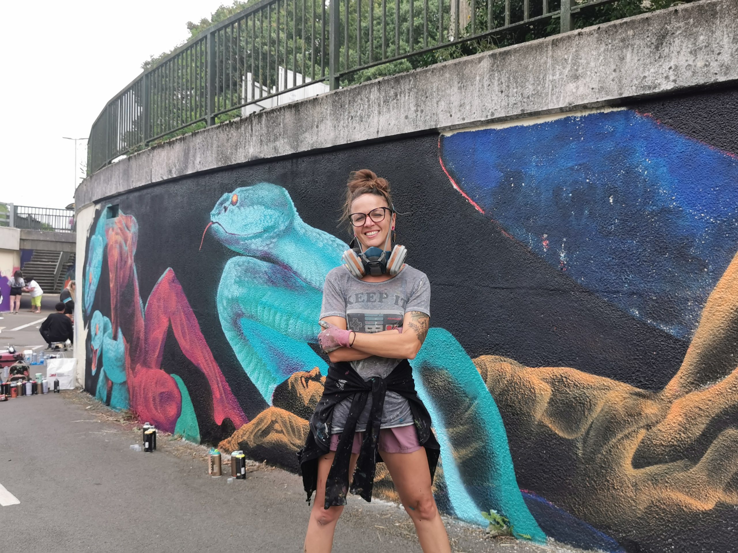 Anna Charney is an artist from Denver. Shown here next to her completed mural on Princess Elizabeth Way. it's a piece which takes influence from the sea and from the golden ratio a common pattern seen within nature. It features interweaving patterns reflecting the flow of the natural world.