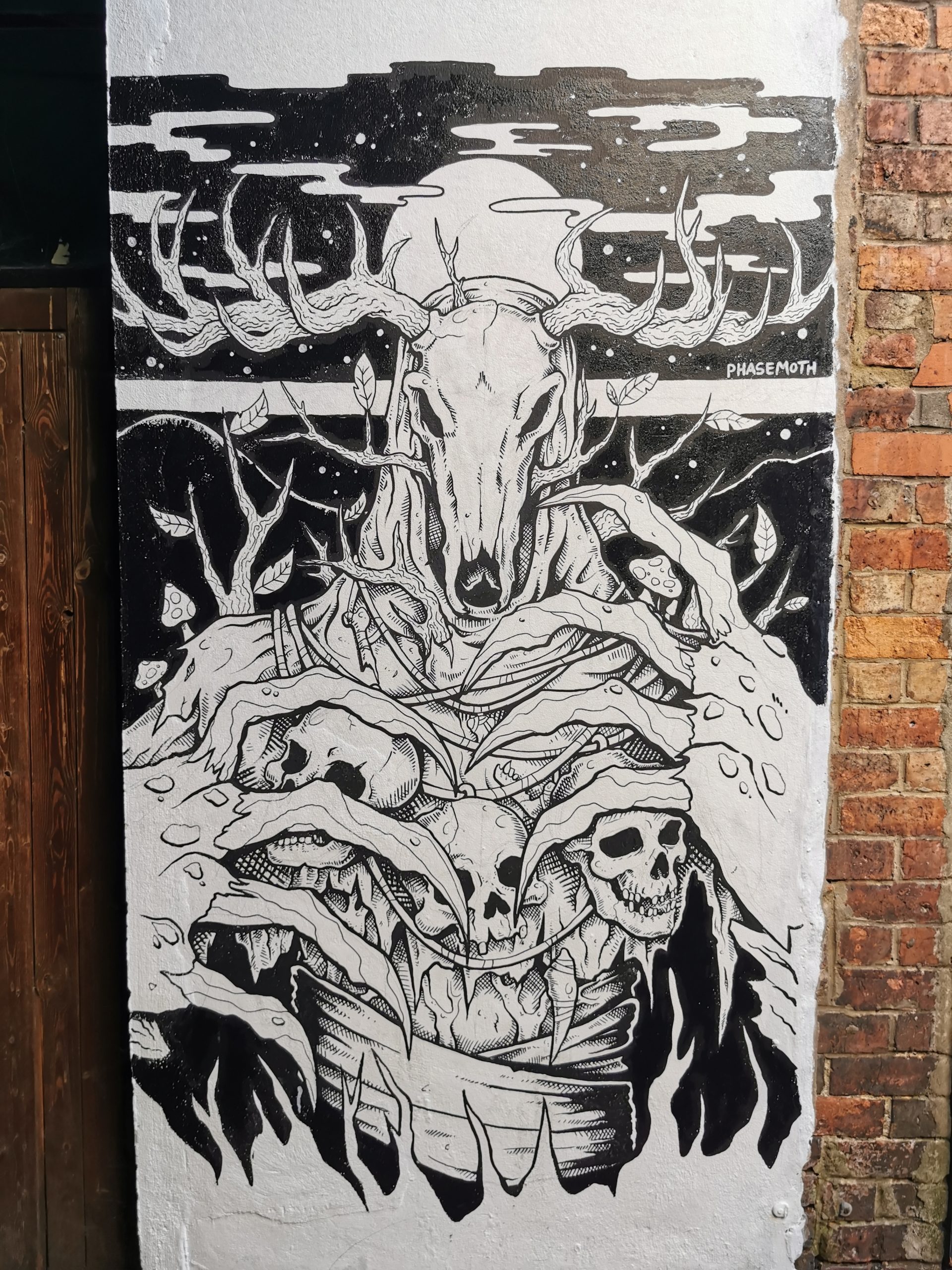 Another regular location at the Cheltenham Paint Festival. The backyard of the Frog & Fiddle has a courtyard with a mixture of permanent and semi-permanent artworks.