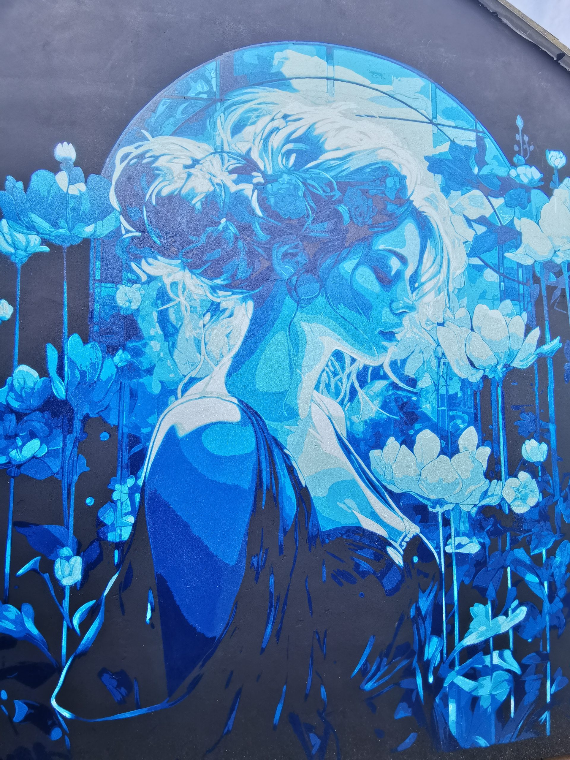 A residential building on Swindon Road now has a splash of prue blue colour. Pogo's circular mural features a woman's face set against a backdrop of flowers and all painted using blue shades. It's a beautifully delicate work. A regular contributor to the paint festival there are a number of other Pogo works across the town.